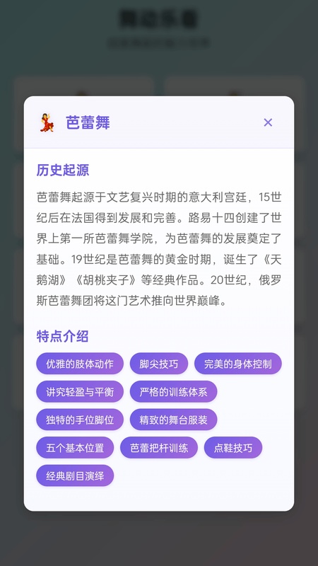 【舞蹈类型探索】在 “舞动乐看” 首页,展示多种舞蹈类型,如芭蕾舞、街舞、民族舞等。点击各舞蹈类型,可查看详细信息,还介绍其优雅的肢体动作、脚尖技巧等特点,帮助用户全面了解不同舞蹈的魅力。