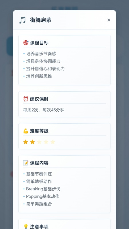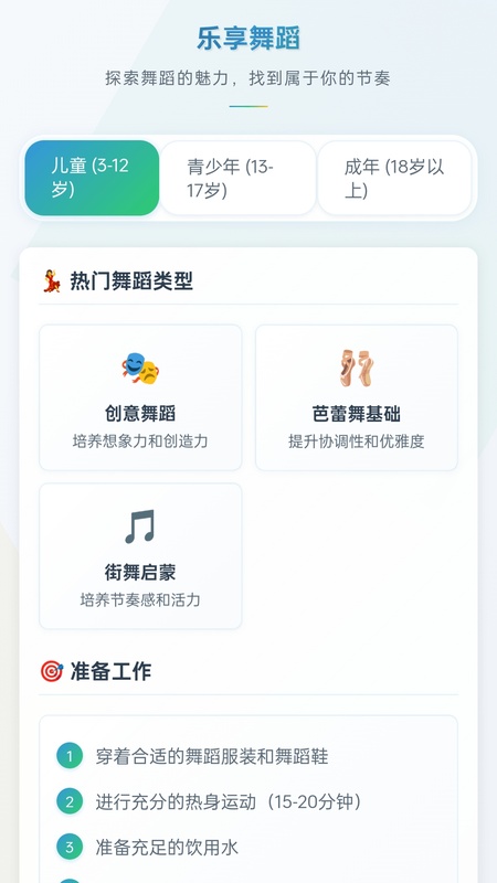 【舞蹈学习指导】“乐享舞蹈” 板块根据年龄分为儿童、青少年、成年专区,热门舞蹈类型课程。给出建议课时、难度等级,介绍基础节奏训练等课程内容及注意事项,为不同年龄段用户提供专业的舞蹈学习引导。 功能特色