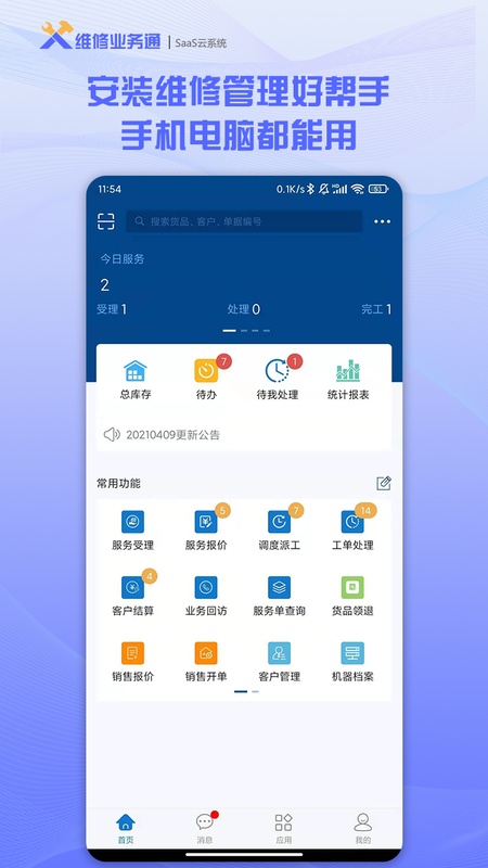 “维修业务通云系统”是专门为售后服务行业研发的一款基于SaaS运营模式的云系统,集报修管理、客户管理、安装/维修管理、机器管理、备件管理、进销存管理、账款管理等为一体,采用导航式界面布局,及强大的流程定义和界面可配置功能,使得软件操作既便捷,又可满足不同行业用户的个性化需求,是售后服务行业一体化管理的好帮手。			软件功能