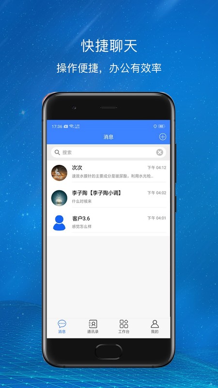 专注于用户与员工相互交流的办公软件,使得俩者相互零距离 客户方便 用户可管理,客户可交流 功能特色