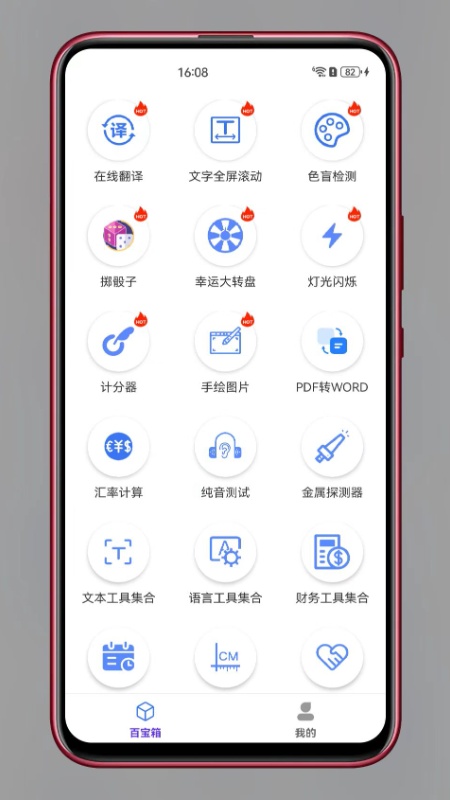 百宝箱APP是一款功能强大的工具类App,集成了众多实用工具。包括在线翻译,支持各个国家语言互相翻译;抖音无水印视频下载;文字全屏滚动,类似跑马灯效果且支持自定义颜色和背景;还有各种文档转换,如pdf转word;具备局域网传输文件功能,可在局域网内实现文件互传,还能实现机顶盒与手机app传输文件;汇率计算可在线实时进行各国之间汇率计算;屏幕坏点检测能检测手机屏幕色彩和屏幕坏点;可提取apk,保存安装包及应用信息到本地文件;能制作纯色图片、进行色盲检测、图片切割、颜色提取、进制转换等。此外,还有视频水印添加、图片圆角设置、图片压缩、二维码制作等功能。在生活查询方面,可进行手机号查询、身份证查询,提供尺子、水平仪、指南针、分贝检测、量角器等实用工具。还有字符长度计算、计数器、掷骰子、大转盘、灯光闪烁等娱乐和实用小工具。另外,涵盖了文本工具集合、语言工具集合、财务工具、日期时间工具集合、转换工具集合、便民查询、开发工具集合、编码解码集合、网络工具集合等丰富内容,如英文字母大小写转换、简体繁体转换、人民币大写转换器、农历公历转换器、二维码生成器、IP地址查询等。