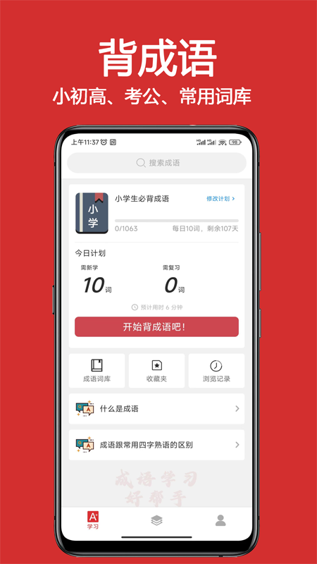 3. 语文同步学:整理中小学考试常用词库,可选择小学、中考、高考、生活常用词库,自由制定每日学习计划学新成语和复习已学成语。
