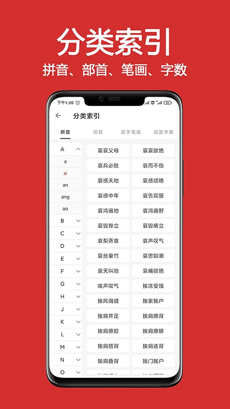 2. 智能检索:支持成语拼音查询、部首查询、笔画查询、字数查询,还能根据成语构词、用法分类检索。