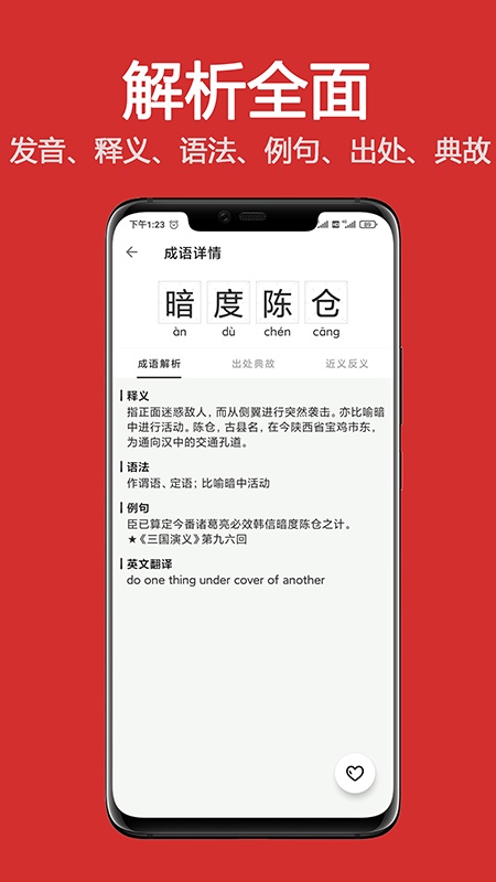 1. 丰富词库:应用词库收录56000条海量成语,每个成语都有详细注解,包含拼音、释义、语法、例句、出处、典故、英文翻译、近义词、反义词。
