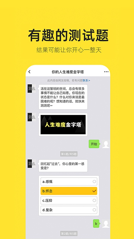 嗨小葩APP为用户提供了丰富的娱乐功能。用户可以随时随地在软件中寻找各种所需的娱乐素材,其中趣味测试内容丰富,能让用户在测试中收获乐趣。同时,软件还提供搞笑图片,满足用户对搞笑元素的需求,并且支持定制头像,让用户可以打造属于自己的独特形象。此外,用户还能邀请好友一起进行测试,增加互动性。