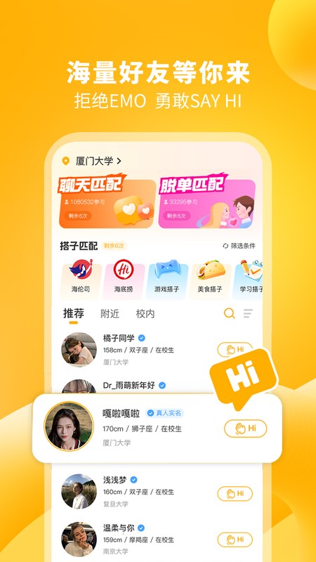 校猿,新一代年轻人交友平台,基于真人实名制认证和个性化的搭子匹配玩法产品设计,致力于打造一个\"年轻人的恋爱交友二次元\",鼓励年轻人通过搭子社交的线上线下交往中获得高质量的情感情绪体验!在校猿,你可以通过发布搭子,聊天匹配等多种个性化的交友推荐方式与同城同校及附近的TA聊天互动,超多用户在校猿快速匹配找到了心仪的TA、知心好友!不想再孤单EMO,那就赶紧下载校猿和小姐姐/小哥哥大胆SAYHI吧!