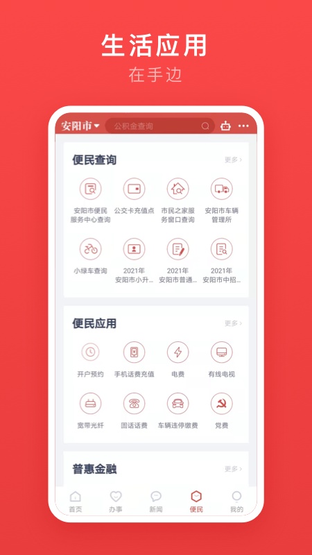 “安馨办”--您身边的安阳市民之家,是安阳市行政便民服务中心为企业和群众提供政务和便民服务的移动端应用,办事人通过身份验证登陆后,即可一站式办理公安、住建、司法、税务、医保、人社、民政、水、电、气、暖等多个部门的多项业务。安阳市行政便民服务中心成立于2001年10月,主要负责各部门进驻事项办理的组织协调、监督管理和指导服务;受理群众对行政机关及其工作人员的意见、建议和投诉。设有行政便民服务大厅、12345联动服务中心(市长便民公开电话)、行政便民网站(市长信箱、在线访谈)等工作机构。各县(市、区)均设有行政便民服务中心,乡(镇、街道)和村(社区)设有为民服务全程代理站点,市行政便民中心在城区还设有房产交易、车管、驾管、水务、燃气和供电6个分中心,形成了我市上下联动、便捷高效的市、县(市、区)、乡(街)、村(社)四级行政便民服务体系。中心曾被授予省文明单位、省工人先锋号、市优化经济发展环境工作十佳服务单位、市服务招商引资工作先进单位、市重点项目建设优质服务奖等90余项荣誉称号,11个局委进驻窗口被评为省优质服务窗口。 应用功能