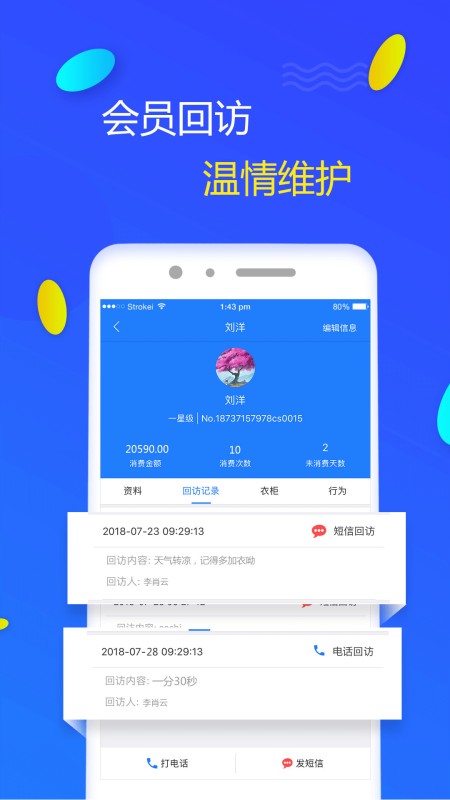 2、会员维护模块:本月新增会员回访、销售回访、生日回访、节日回访、休眠回访、单会员回访等维护功能,增加打电话、发短信回访形式