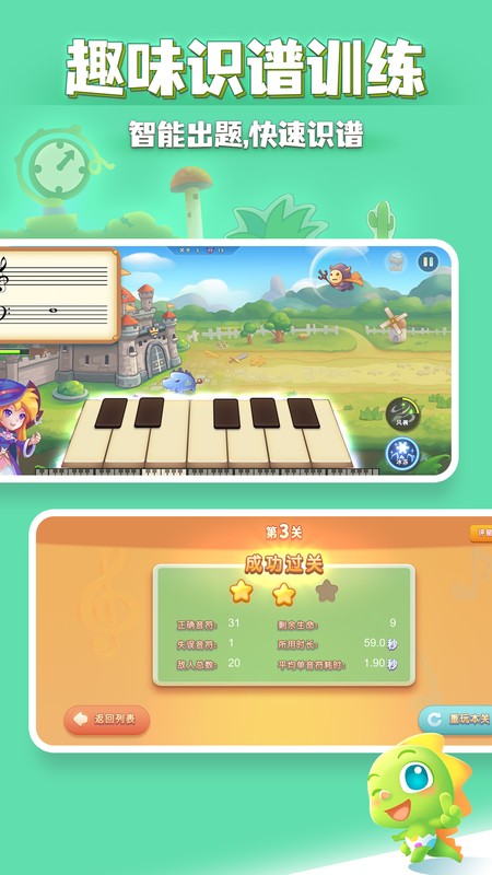 趣味化识谱训练:有趣味识谱训练模块,依据小朋友对音符熟练程度出题,对不熟悉音符加强练习,还依据每节课音符范围进行出题划分,渐进性训练识谱。