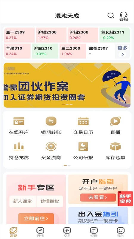 天成奇盈APP业务平台可让用户足不出户办理期货业务,包括开立期货账户、适当性评估、修改基本资料等。交易平台支持期货和期权交易,有投机、套利交易模式,还具备云条件单、云止盈止损、行权单、预埋单、银期转账等辅助交易功能。行情平台提供全面行情服务,有各家期货交易所一档行情,免费提供上期所、能源中心、郑商所五档行情,有偿提供中金所五档行情和外盘实时行情。资讯平台有混沌天成研究院准备的全面期货资讯,如早评、周报、年报、专利和调研,还有24小时财联社资讯。投教平台能提供期货知识、研报等投教内容的直播和回播。
