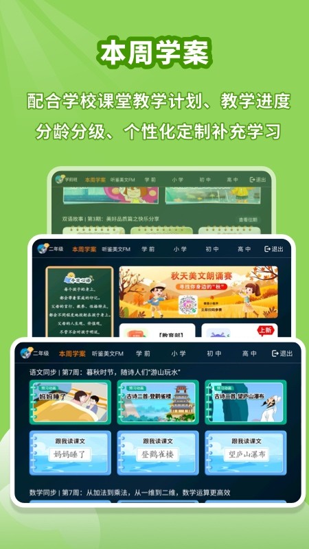 本周学案:依据学校教学进度,提供分龄分级、个性化定制的“本周/在家/补充学习”课程表。