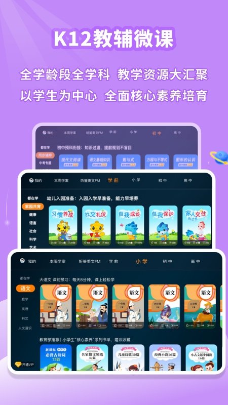 K12教辅微课:按学龄分为学前、小学、初中、高中,提供大学科的核心素养自主学习资源。