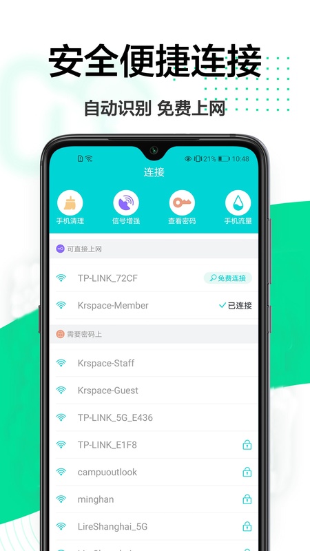 这是一款功能丰富的手机WiFi连接管理软件,可以查看WiFi网络,并连接WiFi。对WiFi进行安全性和网络信号等测试,网络连接情况轻松掌握! 软件功能