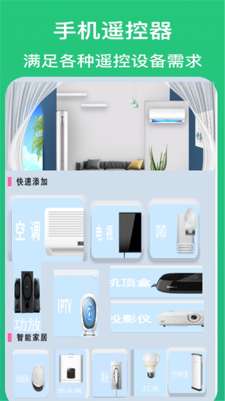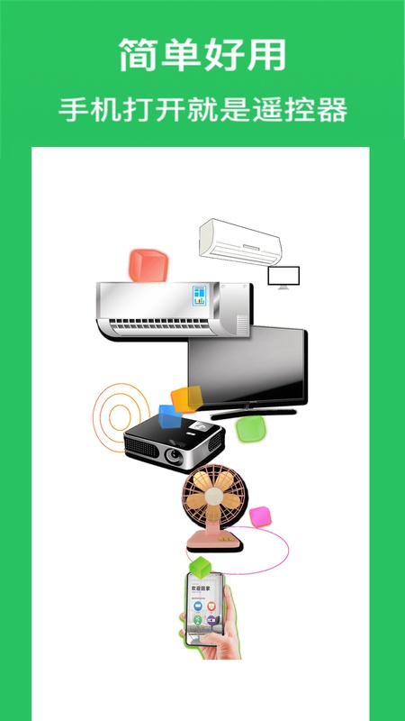 通过手机,遥控家里所有家电设备。不管是空调设备、电视设备、风扇等都可以通过手机来进行遥控。再也不用到处寻找遥控器。手机就是你的遥控器。