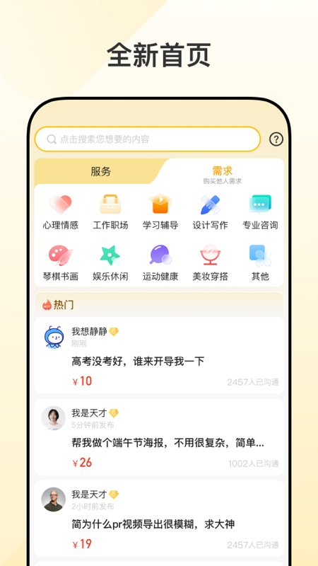 对于有一技之长的人,可在闲暇时增加一份收入;对于有需求的人,能快速找到提供帮助的人,实现能力互通与智慧共享,让生活有更多可能性。