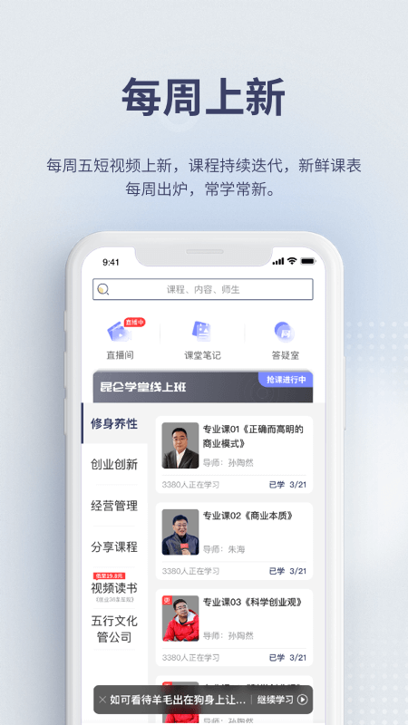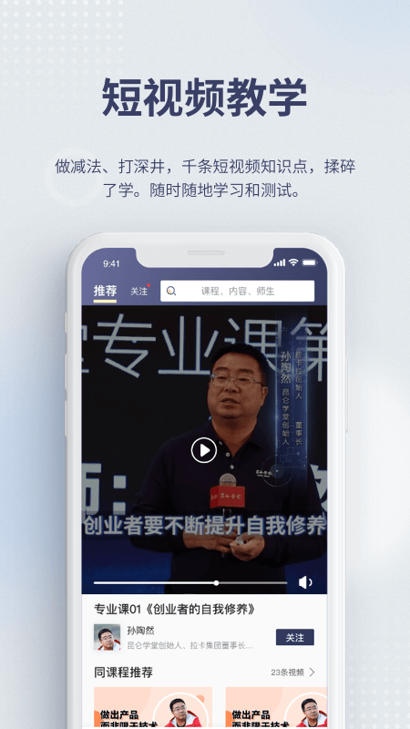 认准一套体系,透彻深入学,导师传帮带,走过创业关键期。昆仑学堂另有提供全国班、模块特训班、手机app、视频读书课等多种拓展学习机会,同学推荐率99%,辅以用基金、奖学金支持,课程对象覆盖企业创始人、合伙人及高管团队。