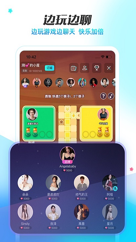 具有聊天功能,可约小伙伴玩游戏、聊天。能自主开播,展示才艺。包含主题直播,有情感、娱乐、音乐等海量声音主播全天候在线;小游戏玩法,如五子棋大赛、在线匹配、好友 PK 等;新增开放元宇宙社交派对。还有实时语音功能。