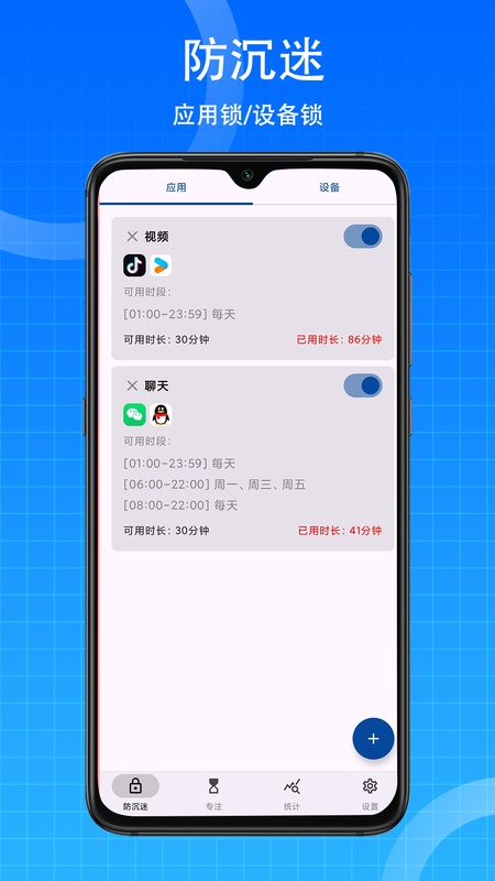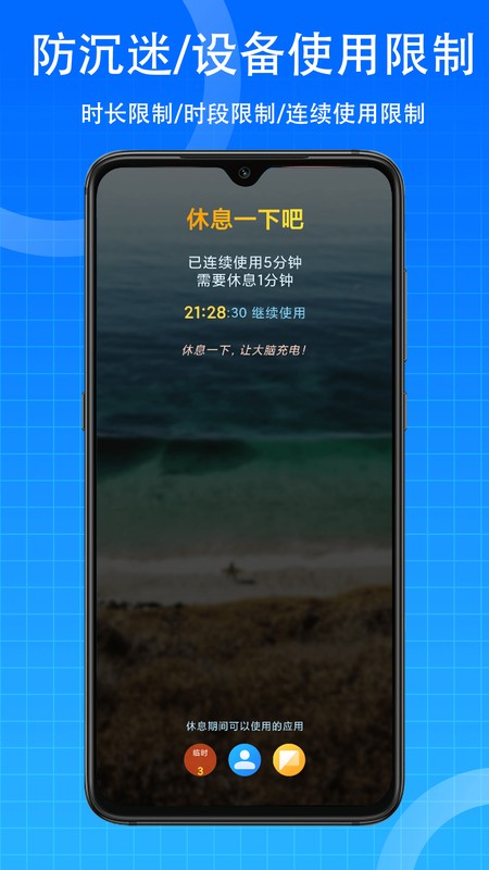 应用锁可监控并控制自己或孩子使用电子设备的时间,达到预设使用时限会自动锁定手机,防止过度沉迷网络或游戏。