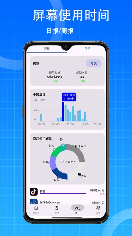 屏幕使用时间可自动追踪屏幕时间,统计每个应用的使用情况,助用户了解屏幕时间分布和习惯,以便改进。