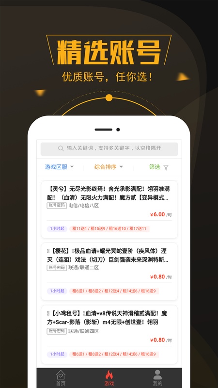 1.精品壕号:每天上架精品大神高玩账号,任意租号!