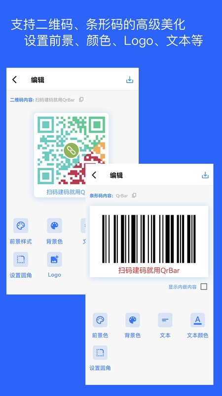 该软件还具备美化功能,对于生成的二维码,可设置前景样式(有图片模版、渐变色模版、纯色模版等,还能从相册选图填充)、Logo(有大量模版,也可从相册选图,支持设置效果、位置和大小)、添加文本及设置文本颜色、设置背景色和改变圆角;对于生成的条形码,可设置颜色、背景颜色、添加文本及设置文本颜色,还能设置条形码的圆角。