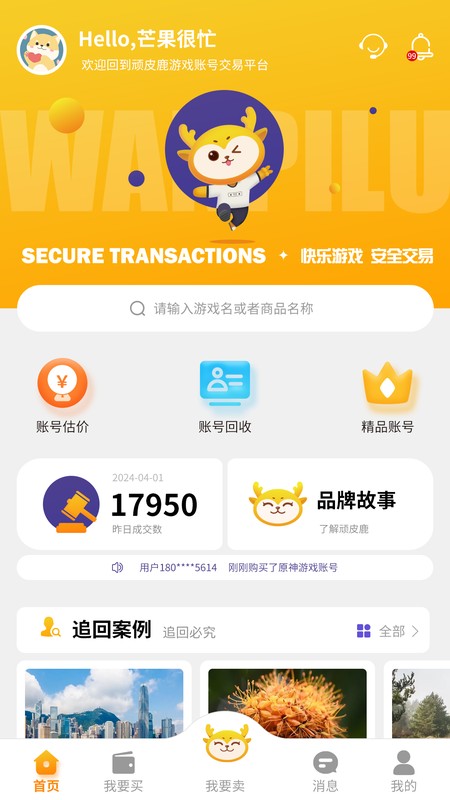 顽皮鹿是国内提供游戏账号交易服务的专业平台,服务内容包括手游、端游、页游以及steam等,网络、单机、休闲游戏账号,客户端包括网站和app软件,为玩家提供大而全的一二手毕业闲置游戏账号交易、代售、担保与回收。让用户放心交易,开心游戏,是全体顽皮鹿人的使命! 应用功能