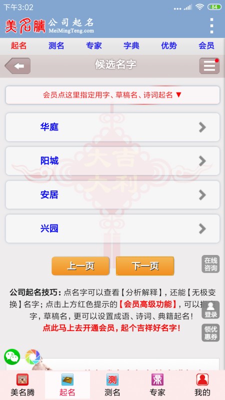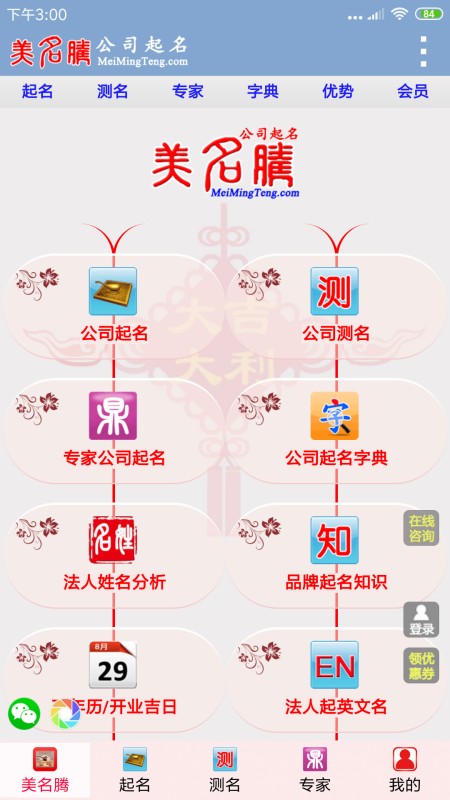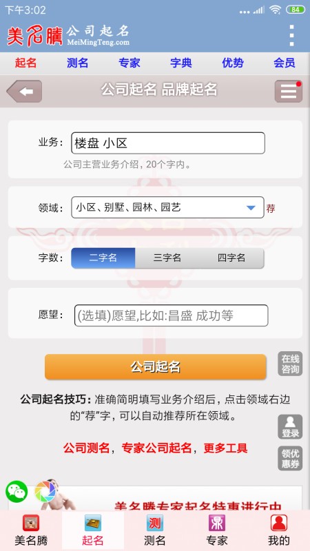 美名腾智能公司起名软件是智能起名理念的开创者,让一个公司名字尽可能多的满足全方位的信息,使其更能体现出品牌价值。公司起名软件目前包含49个大领域,45,372个子领域;根据用户的心愿起名;形,音,意灵活变换;可以从诗词典籍中起名。