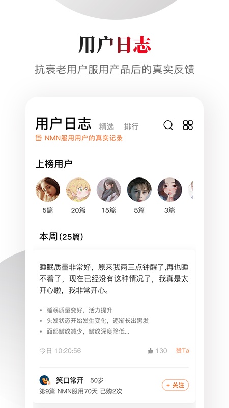【真实用户口碑】APP内含有真实的用户体验,方便大家了解抗衰老效果,零距离接触抗衰老。