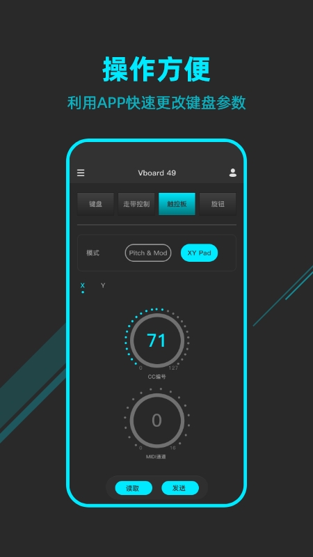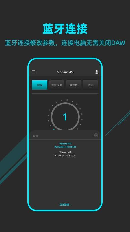 “MIDIPLUS 控制中心”是一款控制 MIDIPLUS 旗下产品属性的辅助 APP,可快速调节产品属性参数。它支持新概念折叠 MIDI 键盘——Vboard 49 进行键盘交互。通过该 APP 连接设备,操作方便,能快速给设备调节参数。还可以直接使用蓝牙连接设备,让设备在连接电脑不断联 DAW 的情况下,也能快速进行参数修改。此外,登陆账户后可进行云端保存,无论换设备还是换手机,都能随时读取云端预设。