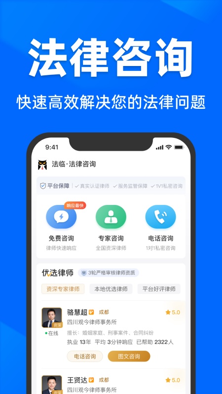 法临APP为用户提供全面的法律服务。具备快速咨询功能,全国多个城市律师入驻,可提供24小时在线免费咨询;还有电话沟通服务,海量律师在线,10秒极速回拨,实现高效便捷的1对1私密电话咨询。找律师板块多维度展示律师信息,涵盖执业律所、擅长领域、职业年限、教育经历、资格证书等,方便用户快速找到合适律师进行1V1咨询。此外,针对各类民事、刑事、商事案件,提供在线咨询、电话咨询、文书代写、合同代写、合同审查、诉讼指导、法律意见书等专业1对1律师服务。平台还提供合同模版,精选专业律师供稿,有婚姻家庭、劳动劳务、公司经营、建筑工程等各类合同模板,支持免费和付费下载。法律问答板块可让用户就各类法律常见和疑难问题向律师提问,律师在线极速响应,支持图文形式提问,同时可查看常见法律问题及对应解答,了解更多法律常识。