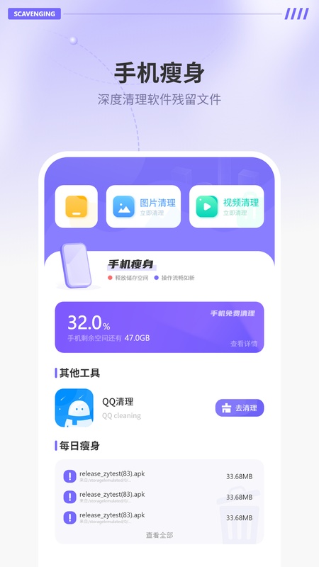 能从多个方面对手机进行清理,全面节省手机空间,让手机更加流畅。