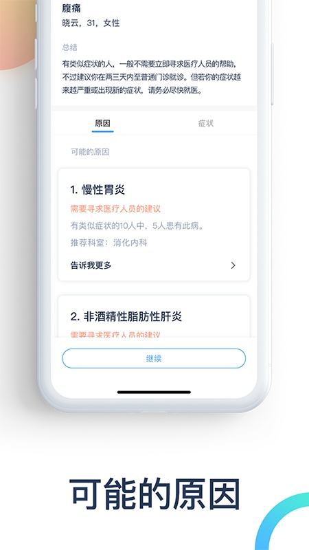 Ada可以帮助用户及家人、朋友分析症状和可能的原因,并给出相应的建议。它深入学习了数千种症状和疾病,根据用户告知的不舒服症状,如肚子痛、头疼、发烧等,通过询问相关问题,对用户回答进行分析,评估可能的原因,最后生成一份评估报告。