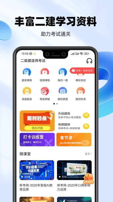 新人注册即享二建考试礼包,包含在线视频课程和智能题库大礼包。