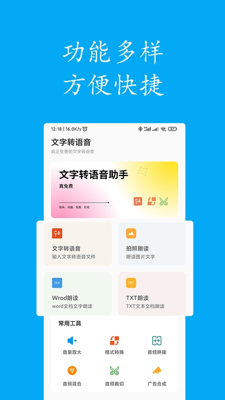 文字转语音功能操作方便,输入内容一键合成;具备拍照朗读,可读出照片上文字;支持Word和Txt文档朗读及转换;能进行音频文件音量放大、格式转换、拼接、混合、裁切;可合成广告促销、地摊叫卖等多种配音;还有方便的语音导出功能,一键分享、导出。