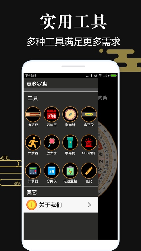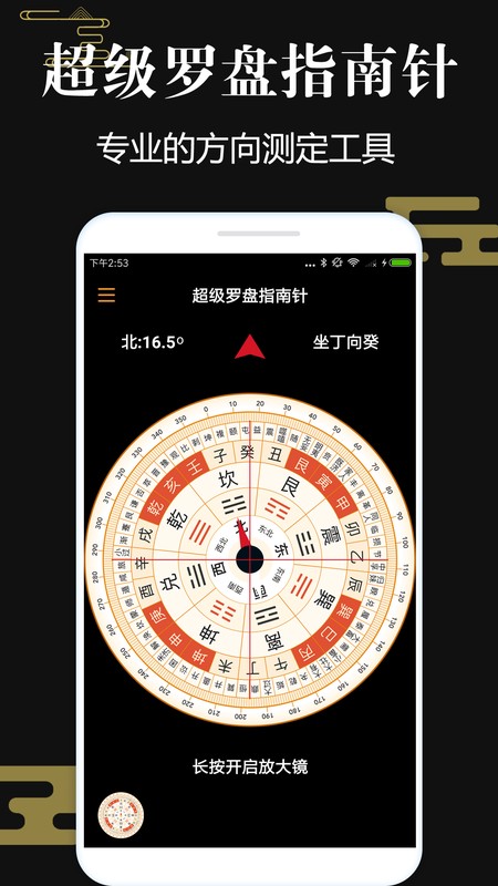 拥有万年历功能,可查询日期、农历、吉日时辰;提供20种不同类别的罗盘供用户选择,能测量不同方位的角度方向值,满足用户对生活中方位测量的需求。