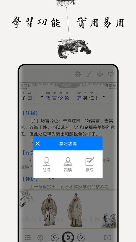 论语图文有声国学软件是由爱好国学的团队所制作,其内容以弘扬中国传统文化、表达儒家思想、体现古人智慧魅力为主,老师深情的朗诵、准确的拼音、完整的注释、甜美的译文、易懂的启示、有趣的故事、水墨风插画、还有实用/易用的学习功能...使其声情并茂从而提升用户的阅读兴趣。