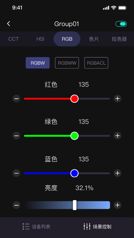 能控制多种灯光类型,如单色灯、CCT灯、RGBW灯。可自由调节灯光的色温、亮度、色相和色彩饱和度。