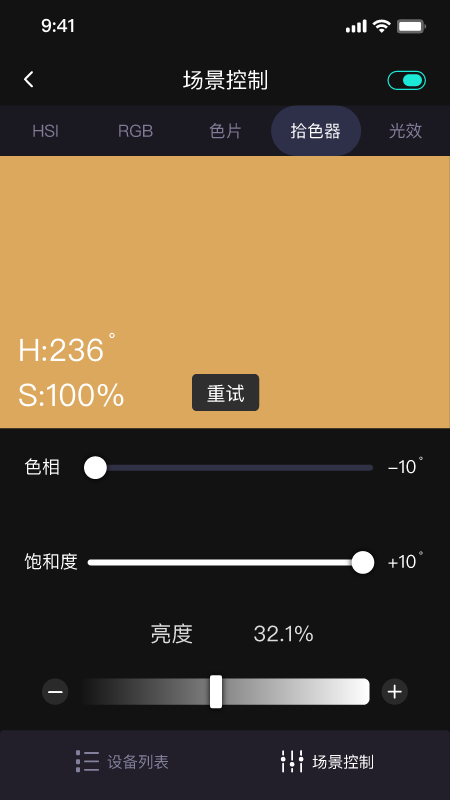 自由调节灯光的色温、亮度、色相、和色彩饱和度