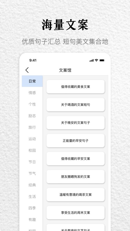 文案馆APP提供海量金句,关联句子出处与作者,内容丰富,包含文学好句、个性签名、毒汤、鸡汤、励志、说说、名言等。还能让用户轻松获取朋友圈早安、晚安问候语,微商文案素材,优美语录、句子、个人签名、个性说说等精选资源。