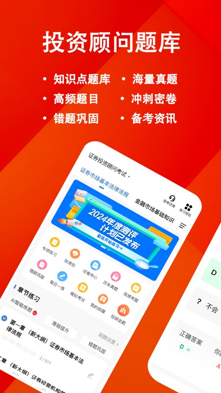 具备章节练习、历年真题、易错题目、错题巩固、学习资讯、智能组卷、智能刷题等功能,涵盖证券投资顾问相关科目,可进行科目练习和模拟考试。