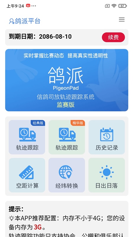 鸽派(监赛版)是信鸽行业第一款立足于LBS应用,集比赛集鸽、运输、司放管理为一体的APP软件。软件具有比赛管理、坐标定位、空距实时播报、运输轨迹描绘、现场拍照、短视频录像等功能。 软件功能