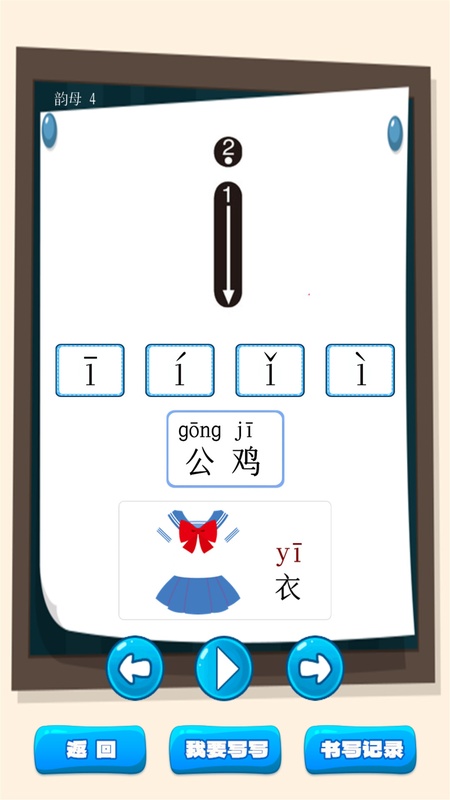 在汉语拼音的读与写模块,可对24个韵母、23个声母、16个整体认读音节进行读写学习,实现发音和书写同步学习。