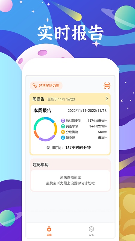 听力熊APP支持听力熊系列智能点读笔、听力机、单词机等设备的联网绑定、数据传输和操作记录功能。家长可通过蓝牙绑定智能硬件,实现状态同步与数据传输。还能即时查看设备状态,查看学习书籍。此外,针对不同年龄层的孩子,APP提供学习辅助及资源。