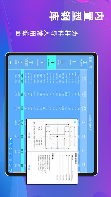 ·支持单位模式和简单的符号输入,内置材质库可以直接导入型钢截面;