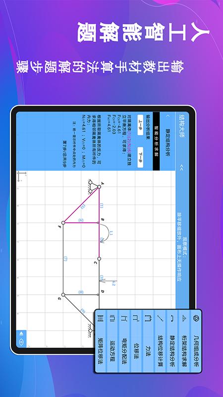 独特的智能模块,利用人工智能学算法支持输出结构力学教材上手算方法(位移法、力法…)的解题步骤。