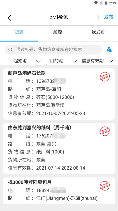 【物流信息,自主发布】- 在平台上查看船源或货源,并提供对应的联系方式,即可查看空船信息和货源信息。 软件功能