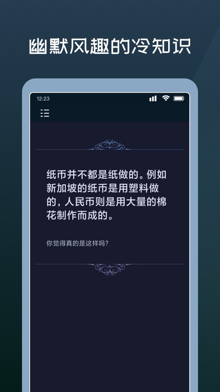 该App能为用户提供简单的答案和暗示,帮助用户解决内心问题。同时,它还包含幽默风趣的冷知识以及抛开常理的冷问题,开启用户的解惑之旅。
