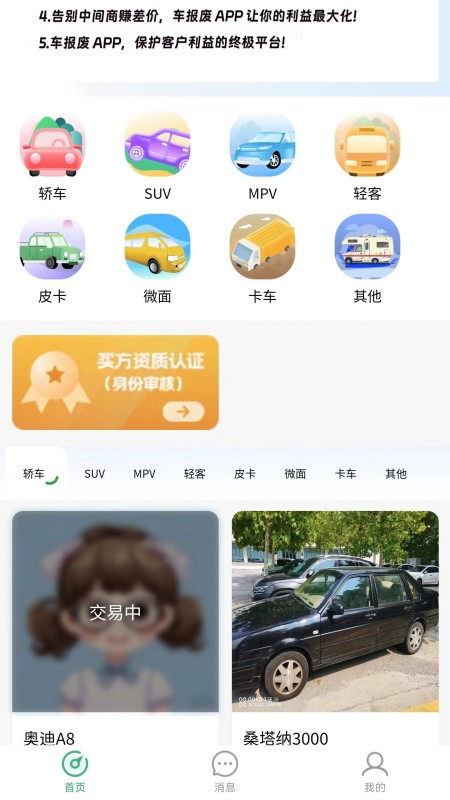 车报废APP平台,专注报废汽车是我们的专业,我们的宗旨是让所有的车辆卖到车辆应有的价值,没有任何中间商赚差价,实现客户与终端直接对接且平台最大程度保护客户利益。 软件功能