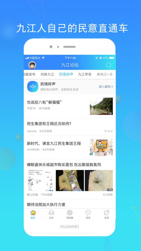 九江论坛APP集民生、资讯、服务功能于一体,致力成为九江有影响力的移动互联网交流平台,着力打造属于九江人自己的“民意直通车、同城生活圈”,你只需指尖轻触即可完成投诉爆料、吐槽八卦,随时了解九江身边大小事。 功能特色