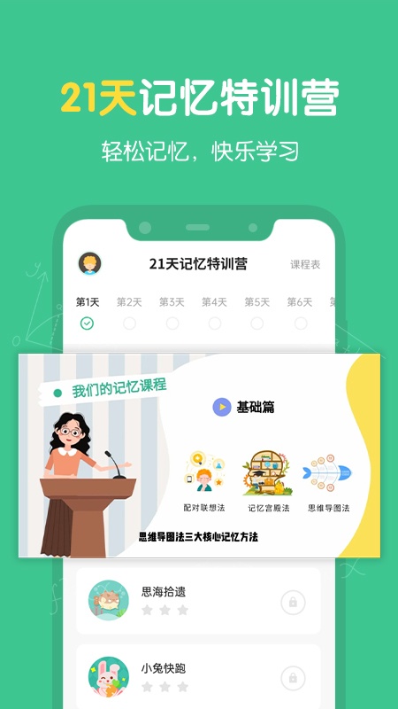 超级记忆力APP由国内脑科学专家与记忆专家联合设计,采用动画课程 + 趣味训练的授课模式。为学员打造21天特训课程,课程分为基础篇、实战篇与拔高篇,配合多个大脑训练项目,形成有学、有练、有测的教学闭环。